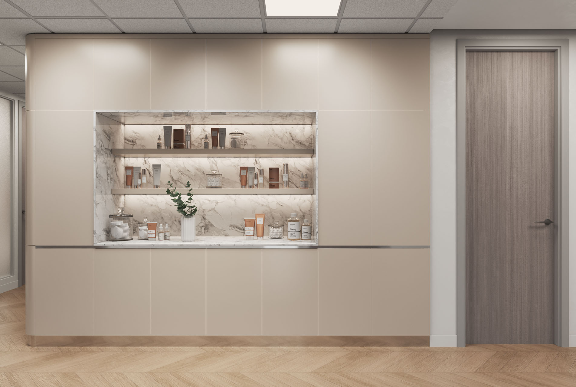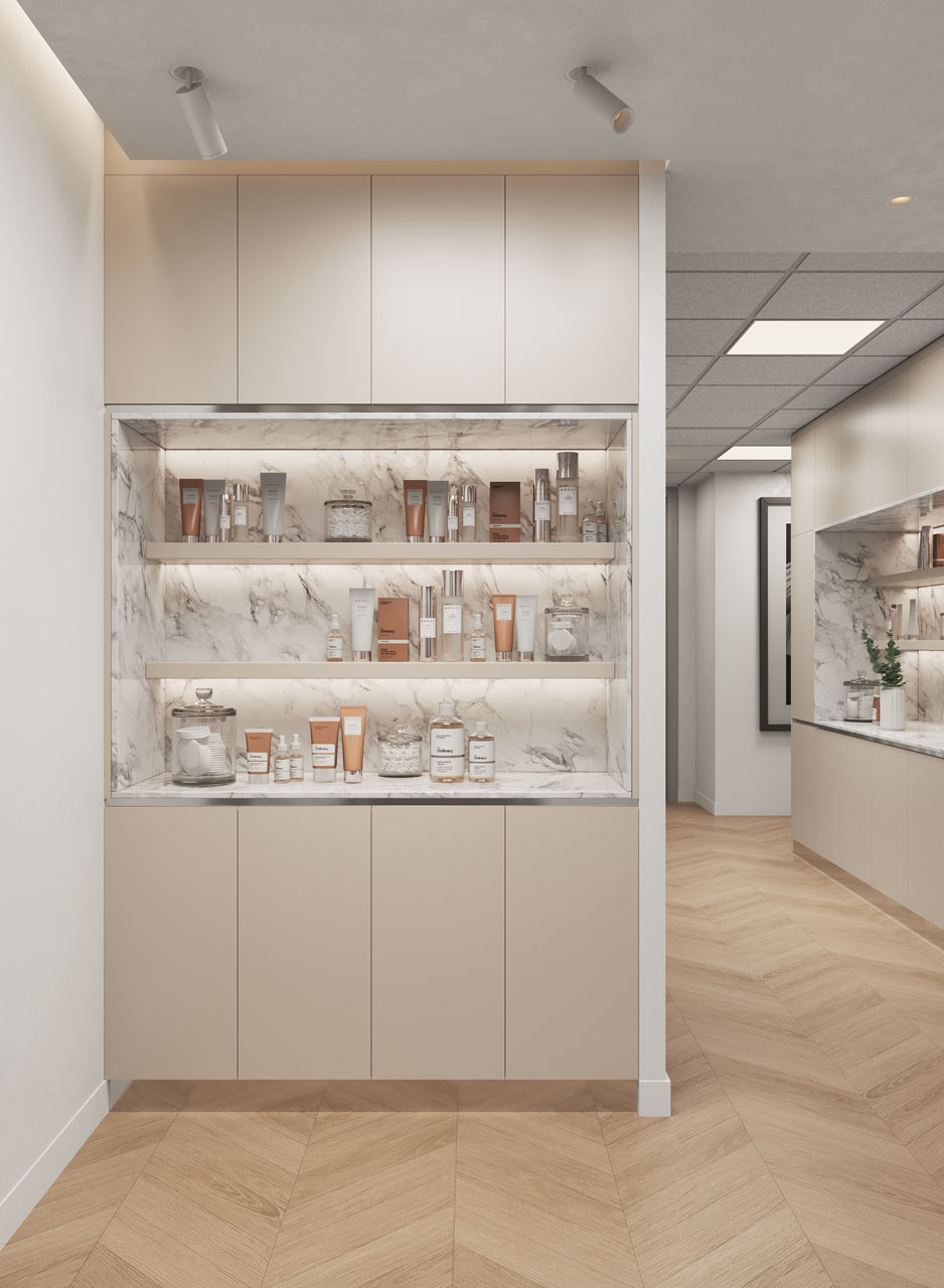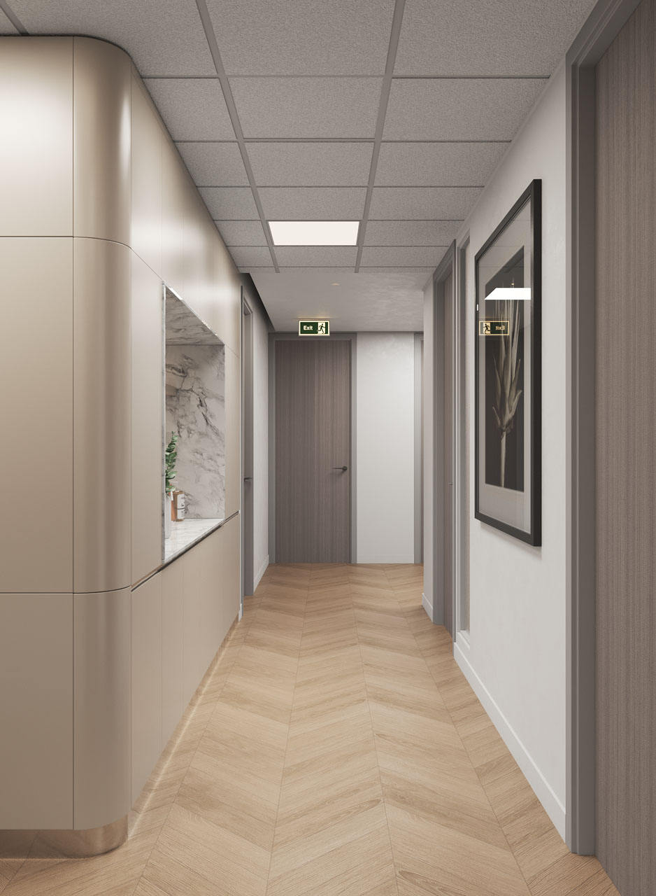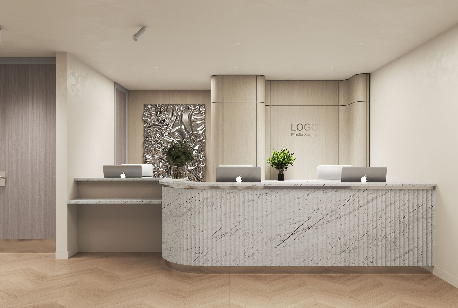 We are proud to present our design for a plastic surgery clinic, where warmth and beauty are at the forefront. The interior features warm tones throughout, creating a welcoming and aesthetically pleasing environment for clients. The clinic includes several examination rooms, private consultation cabinets, and a spacious main entrance area. To add a luxurious, bespoke touch, we incorporated natural stone and wood paneling into the design. Every detail has been thoughtfully crafted to ensure a comforting and elegant atmosphere, making every visit a pleasant and memorable experience.