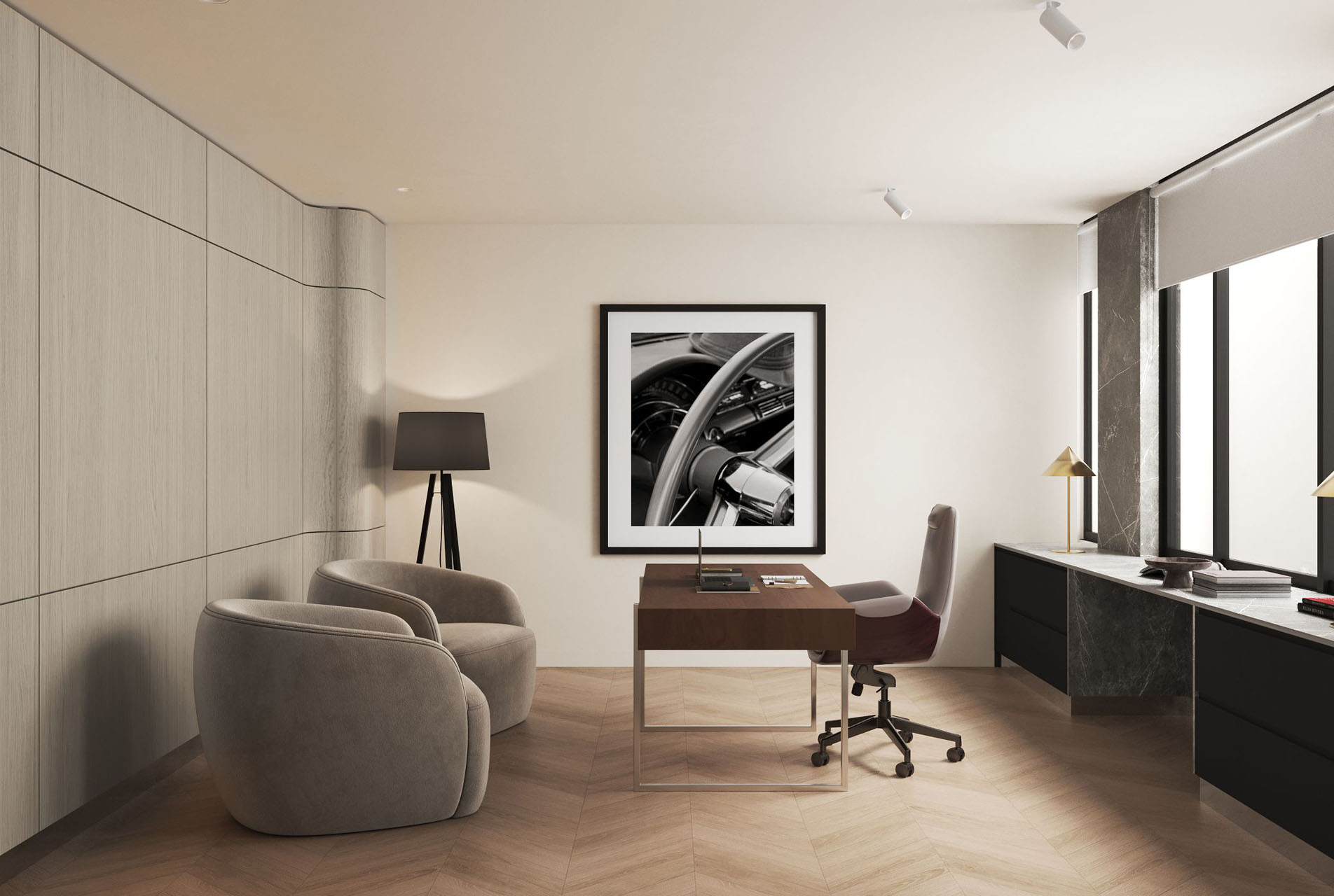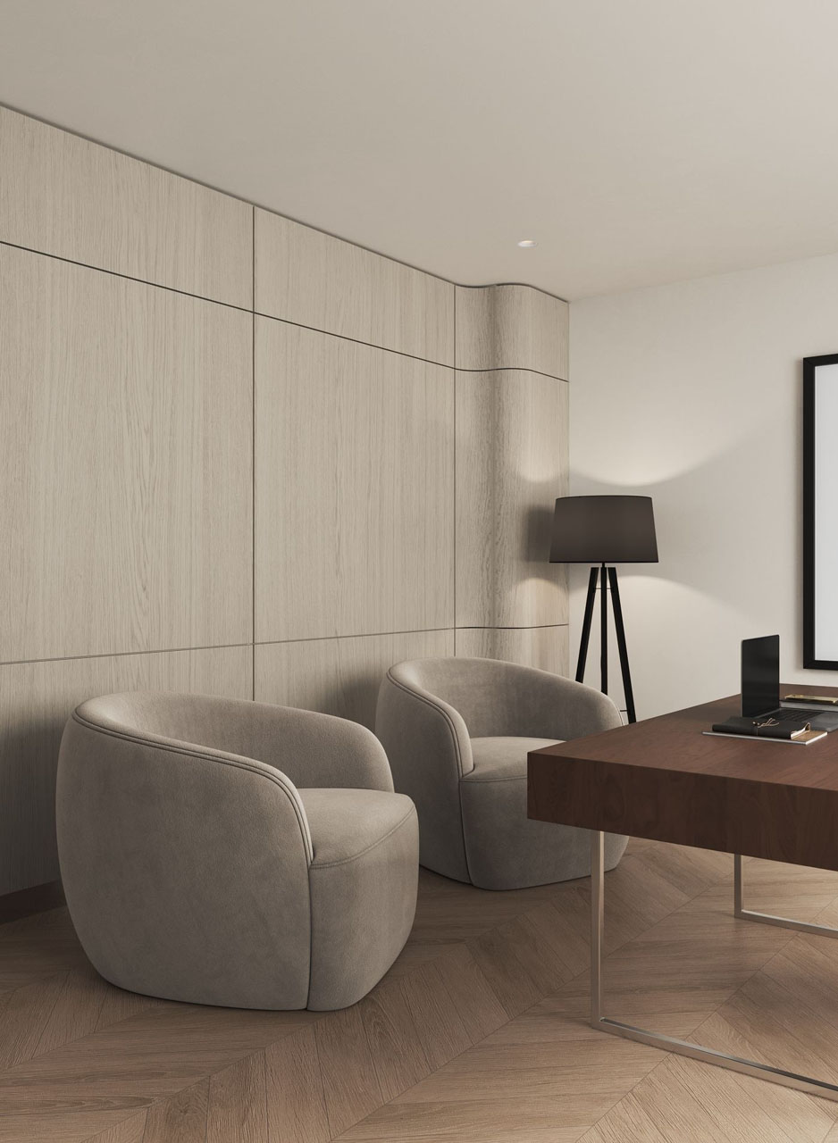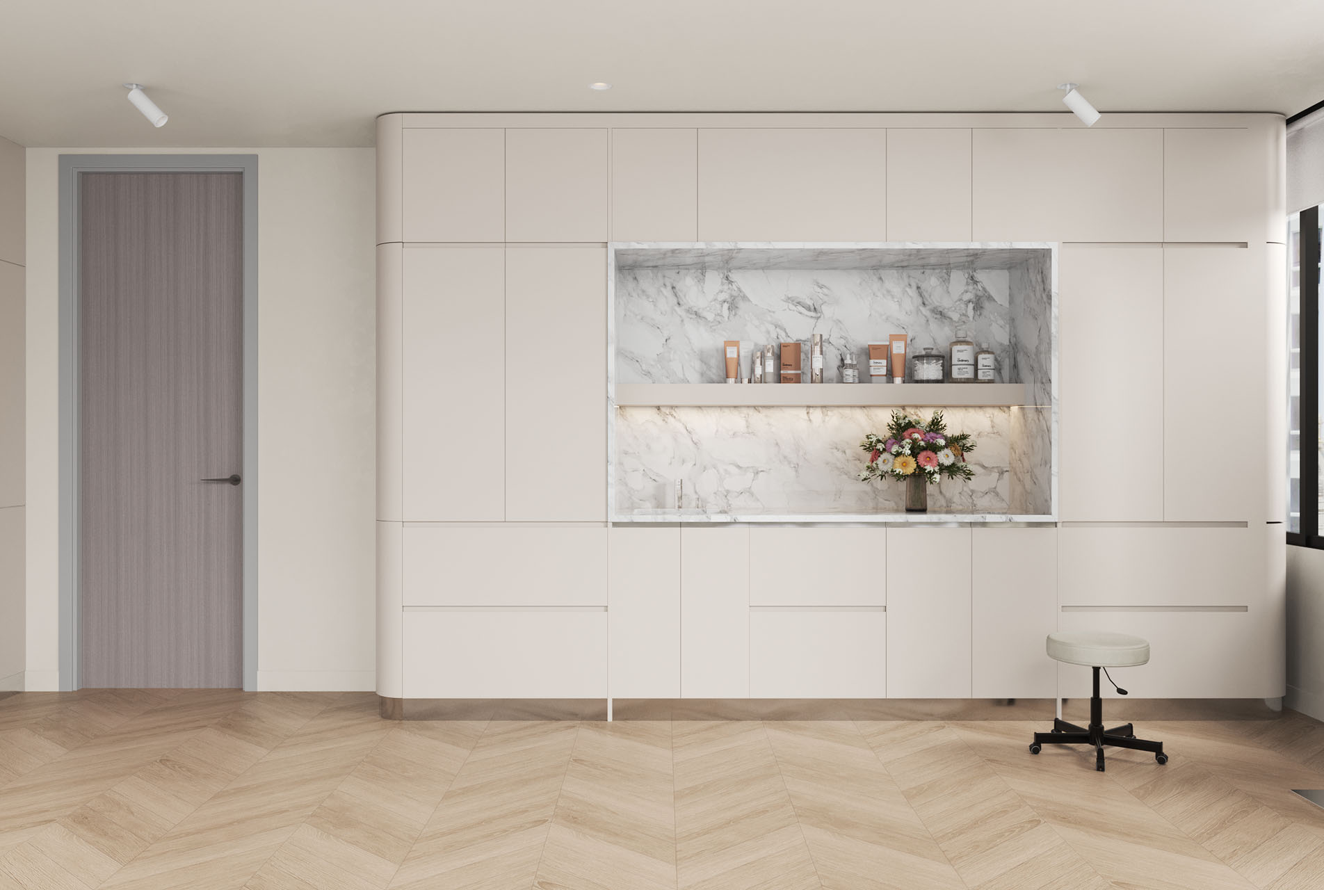 We are proud to present our design for a plastic surgery clinic, where warmth and beauty are at the forefront. The interior features warm tones throughout, creating a welcoming and aesthetically pleasing environment for clients. The clinic includes several examination rooms, private consultation cabinets, and a spacious main entrance area. To add a luxurious, bespoke touch, we incorporated natural stone and wood paneling into the design. Every detail has been thoughtfully crafted to ensure a comforting and elegant atmosphere, making every visit a pleasant and memorable experience.
