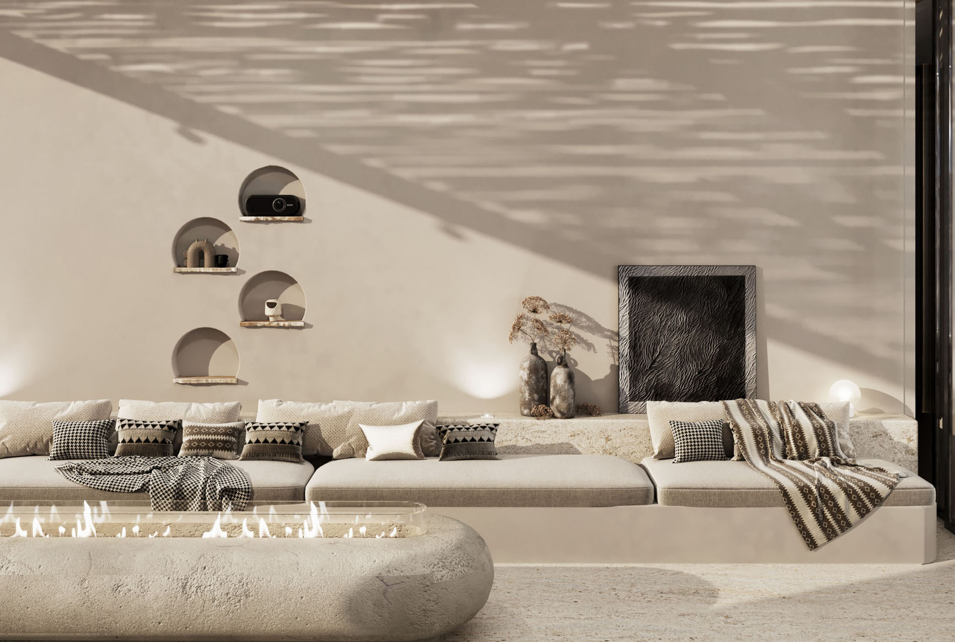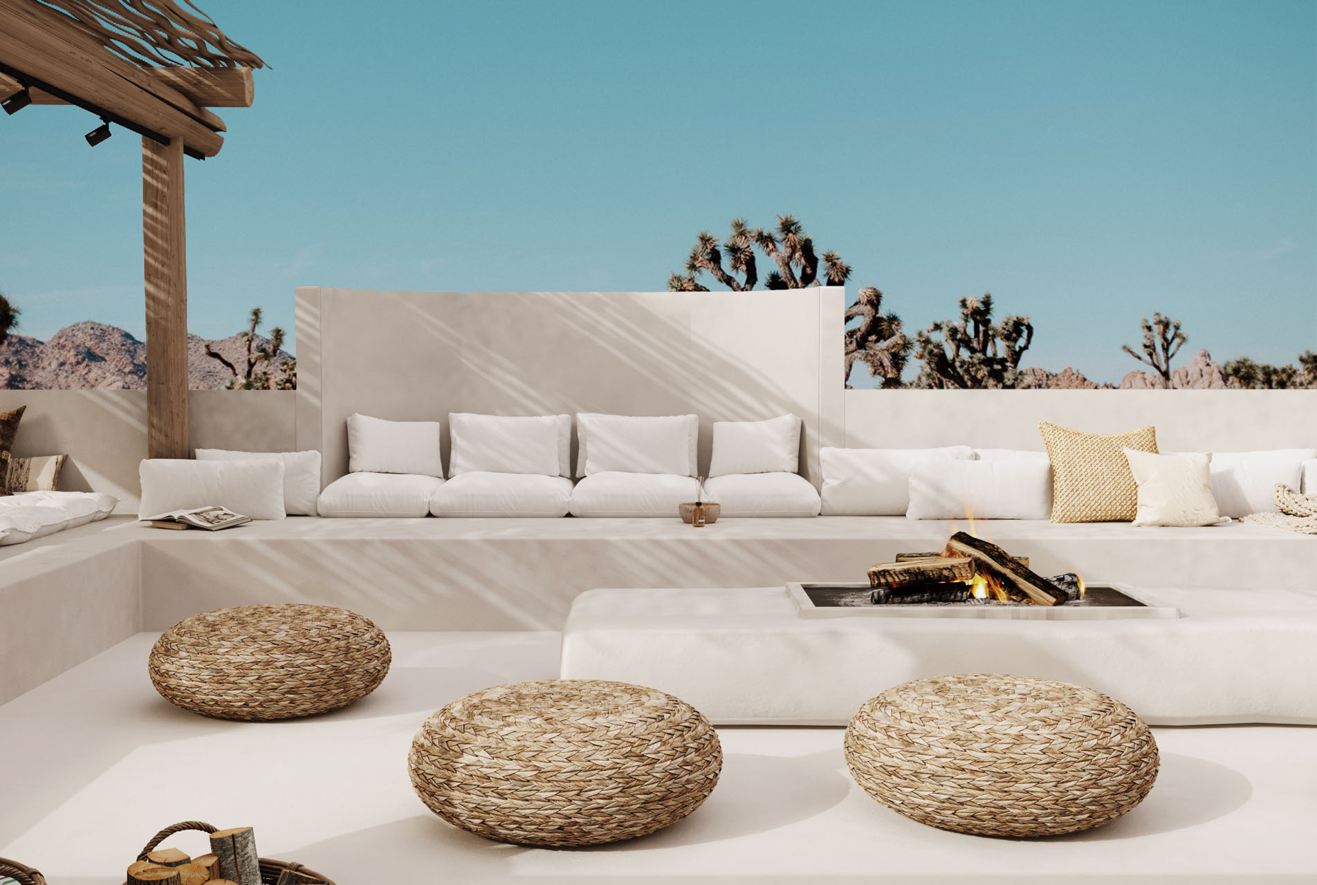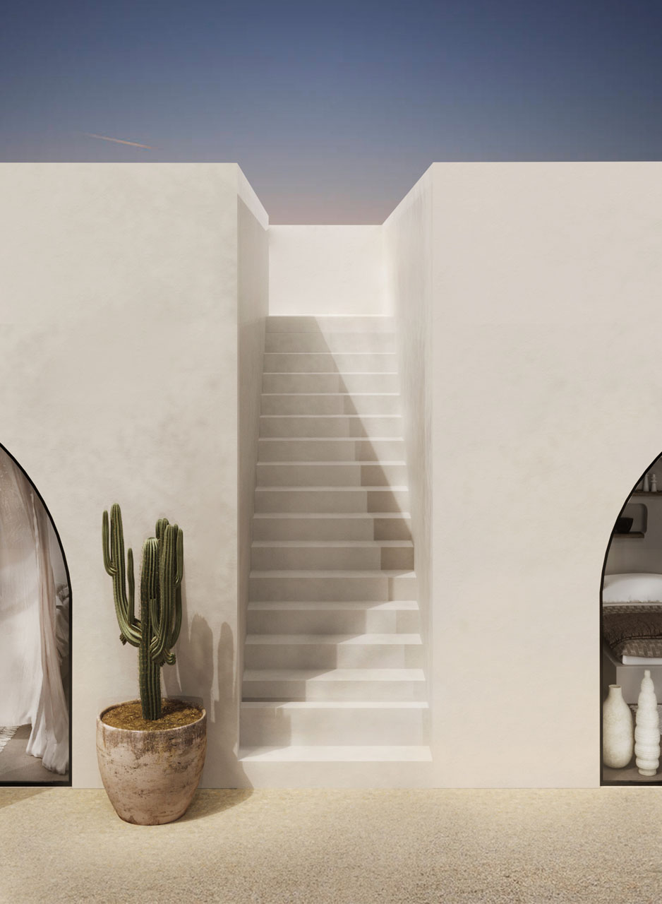 As you make your way through the space, the variation of tones in the flooring blends seamlessly with the natural desert landscape, creating a harmonious and organic atmosphere. The Ibiza-inspired design elements and organic light combine to create an unforgettable vacation experience that will stay with you forever.