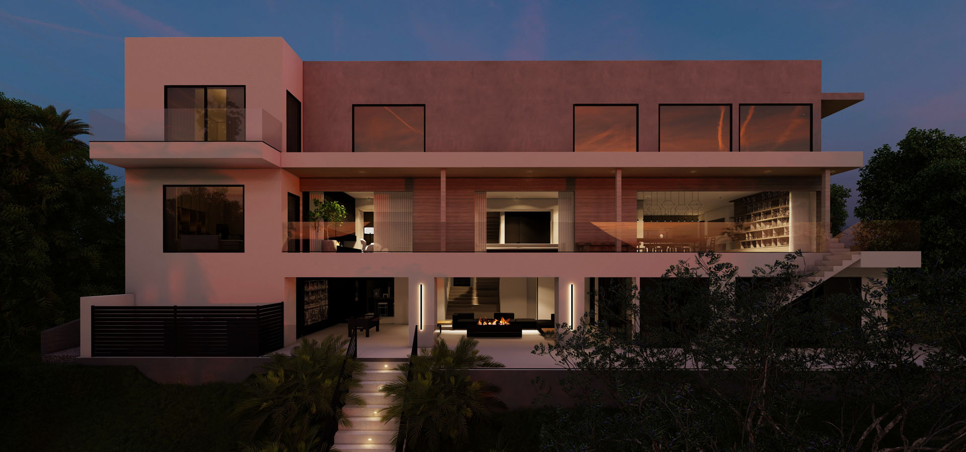 A true standout feature of this magnificent property is the opulent master suite, replete with separate his and her bathrooms and closets. The entrance to the house is via a futuristic bridge that leads directly to the second floor, where the great room and kitchen are situated.