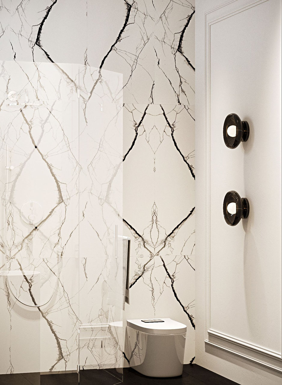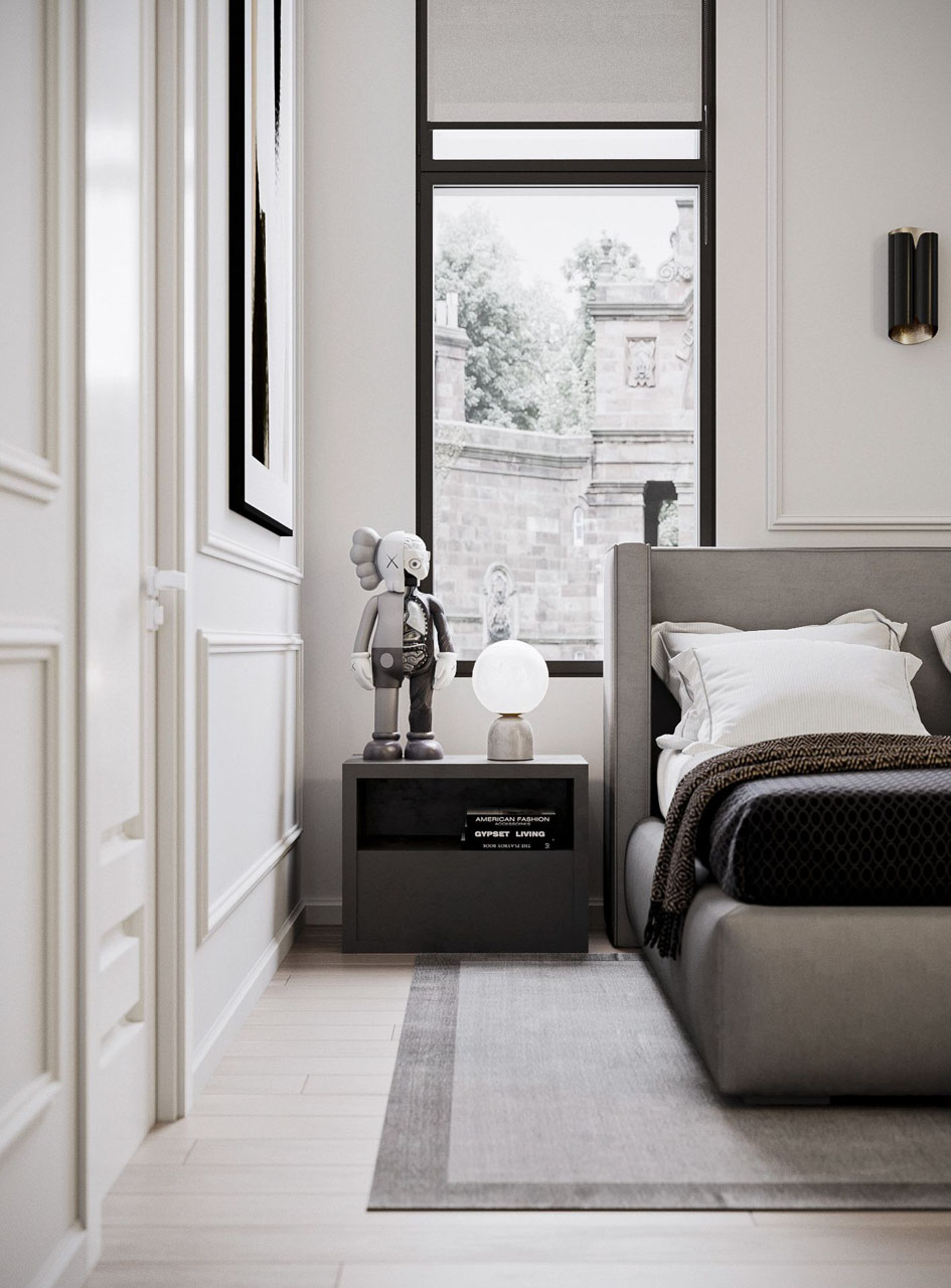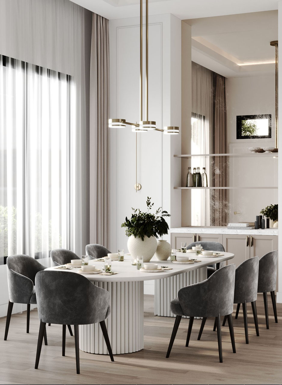 The use of exquisite materials such as moldings, marble, soft curtains with little brass accents, and modern wall texture accents is awe-inspiring, adding a sense of opulence to every corner of the house. The European furniture design seamlessly complements the space and takes the luxury to new heights.