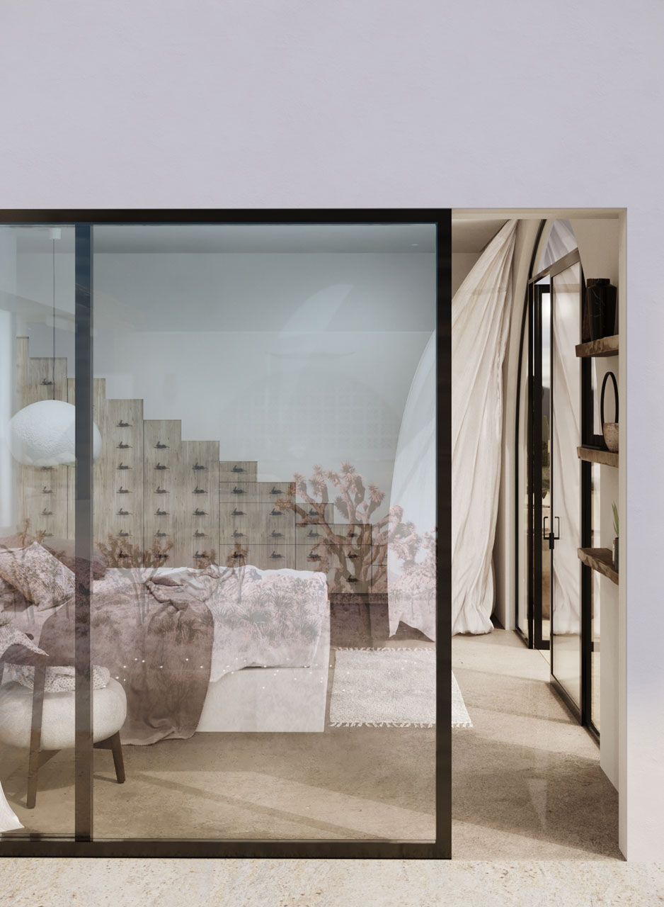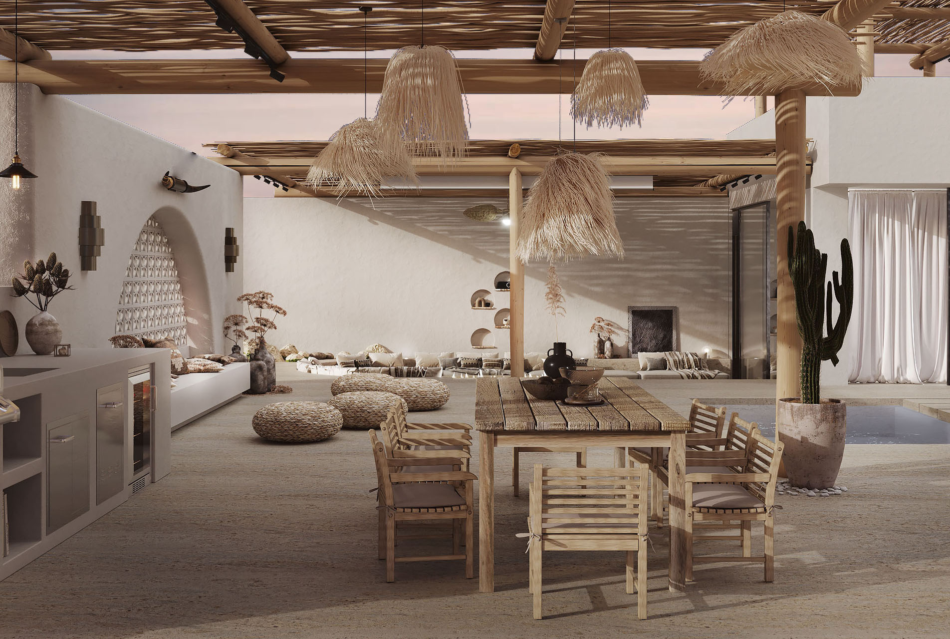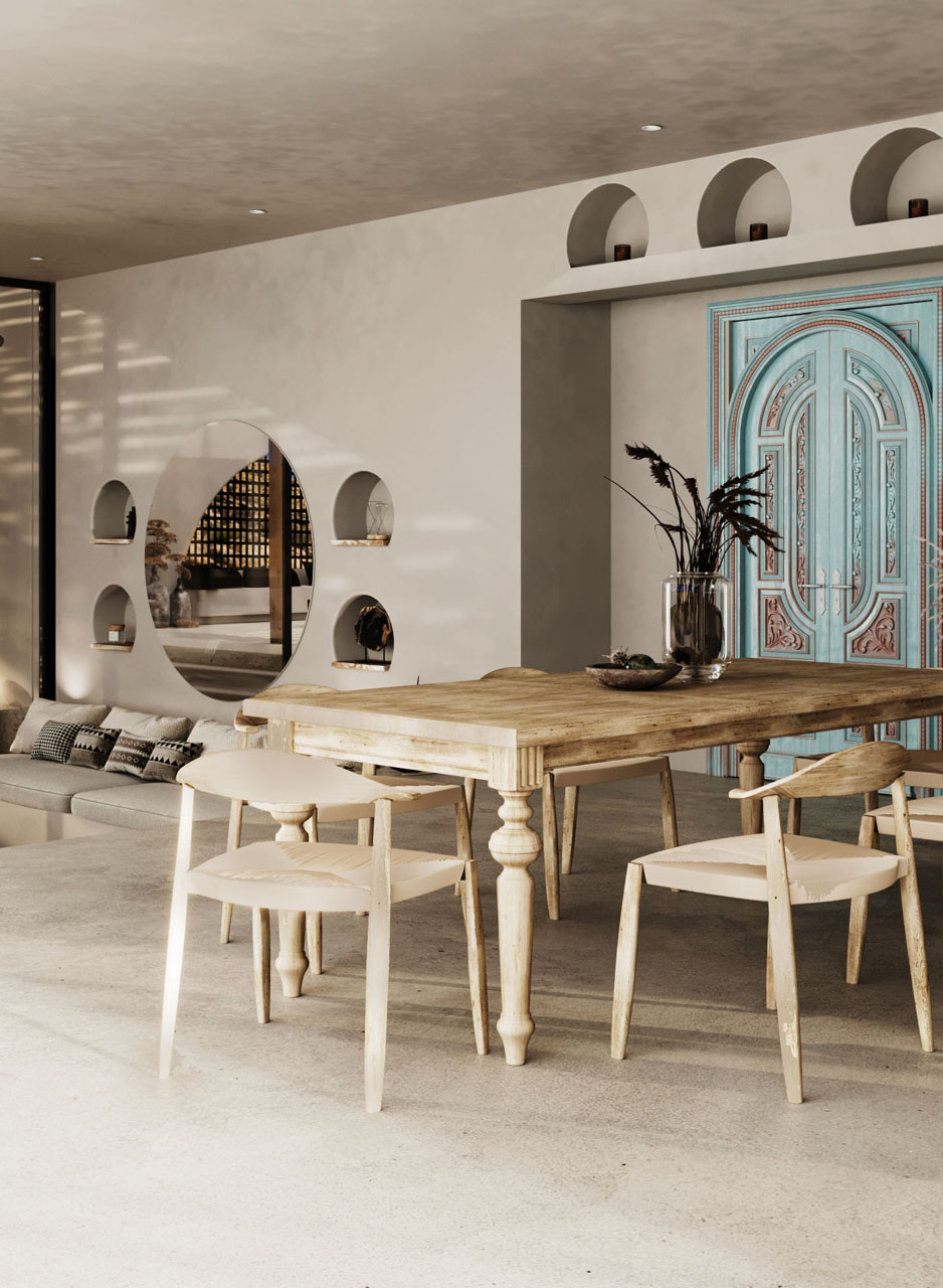 As you make your way through the space, the variation of tones in the flooring blends seamlessly with the natural desert landscape, creating a harmonious and organic atmosphere. The Ibiza-inspired design elements and organic light combine to create an unforgettable vacation experience that will stay with you forever.