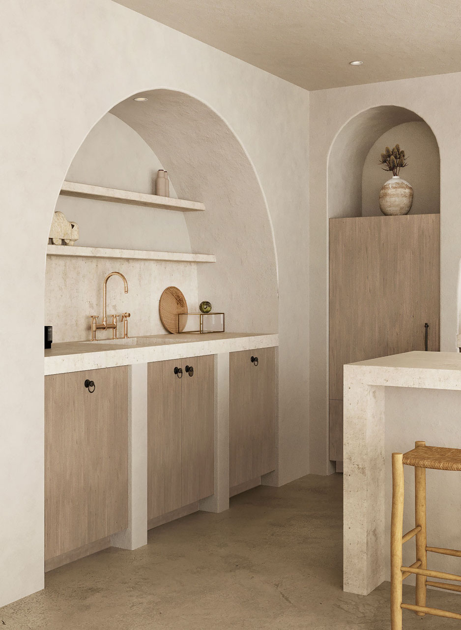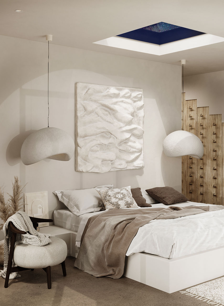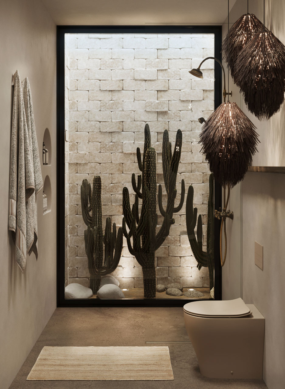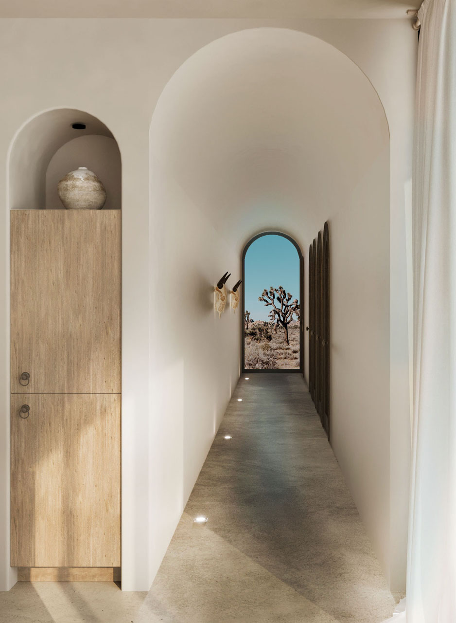 As you make your way through the space, the variation of tones in the flooring blends seamlessly with the natural desert landscape, creating a harmonious and organic atmosphere. The Ibiza-inspired design elements and organic light combine to create an unforgettable vacation experience that will stay with you forever.