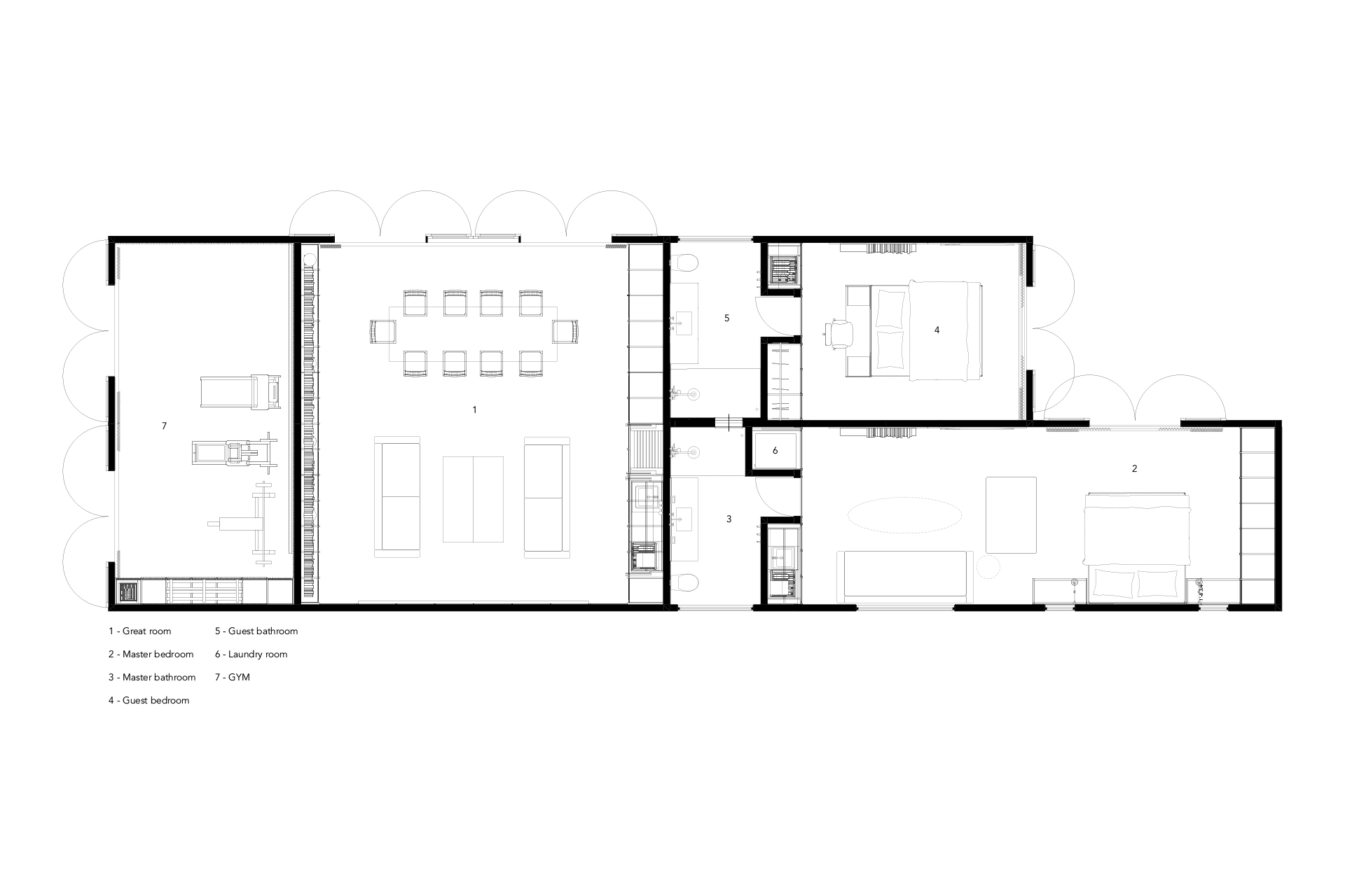The guest house is divided into four zones, each with its own separate entrance to ensure complete privacy for guests: Great room, studio guest room, master guest bedroom, and GYM.