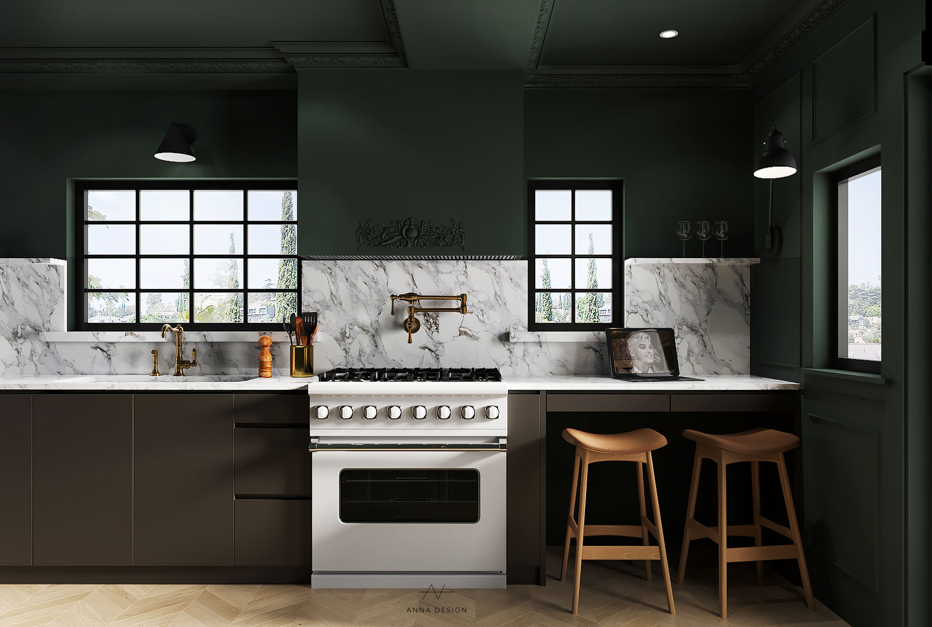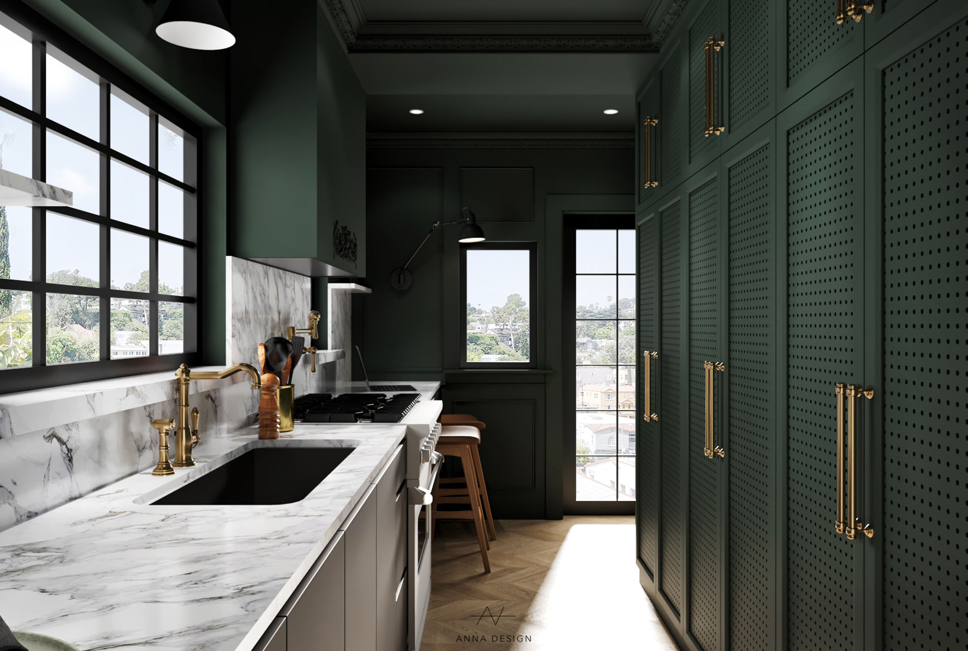 At every turn, this home showcases daring design choices that command attention. In the kitchen, rich green cabinetry dominates the space, stretching upward to the ceiling in a bold, unapologetic statement. The countertops are adorned with striking calacatta marble, whose dramatic patterns add an air of sophistication to the room.